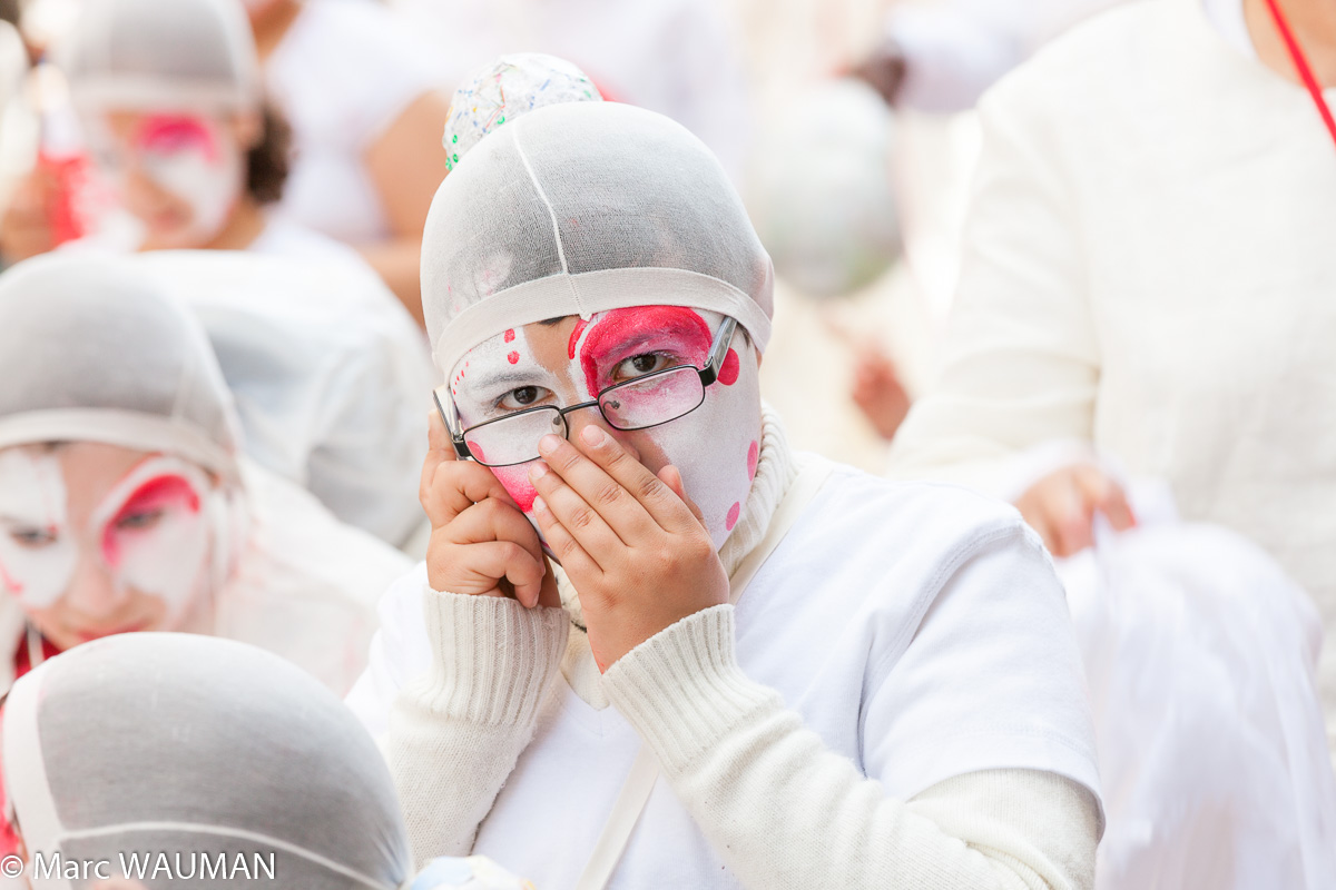 Dans le festif tintamarre du défilé de la Zinneke Parade, alors que chaque participant a son rôle à jouer, cette jeune fille n'a osé ignorer l'impératif d'un appel. Séance tenante, au beau milieu du spectacle, elle s'est saisie de son téléphone qui la houspillait effrontément d'une sonnerie importune et insistante : « Allô ?... Oui, je suis occupée... Mais parle tout bas ; on nous écoute. »